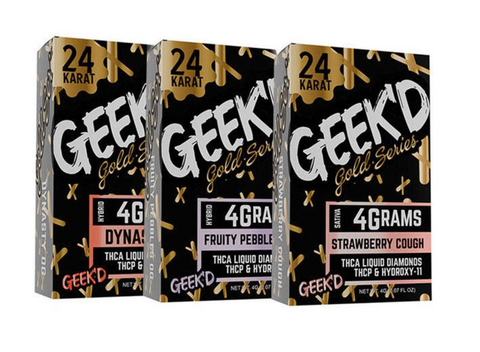El vape desechable Gold Series 24K de Geek’d ofrece 4 gramos (4000mg) de extracto Liquid Diamonds, con una mezcla potente de THC-A, THC-P y HYDROXY-11, ideal para quienes buscan intensidad, pureza y estilo en un solo dispositivo.