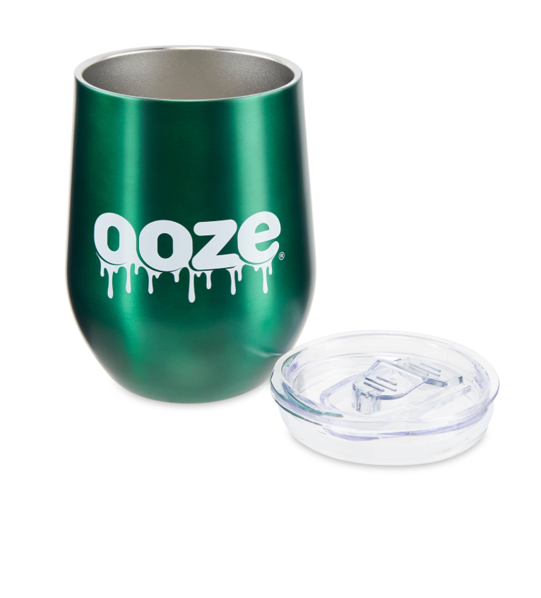 Vaso tipo stemless wine glass de acero inoxidable, con capacidad de 12oz. Su acabado en verde oscuro y el logo Ooze al frente lo hacen elegante y funcional, ideal para llevar a cualquier lugar.
