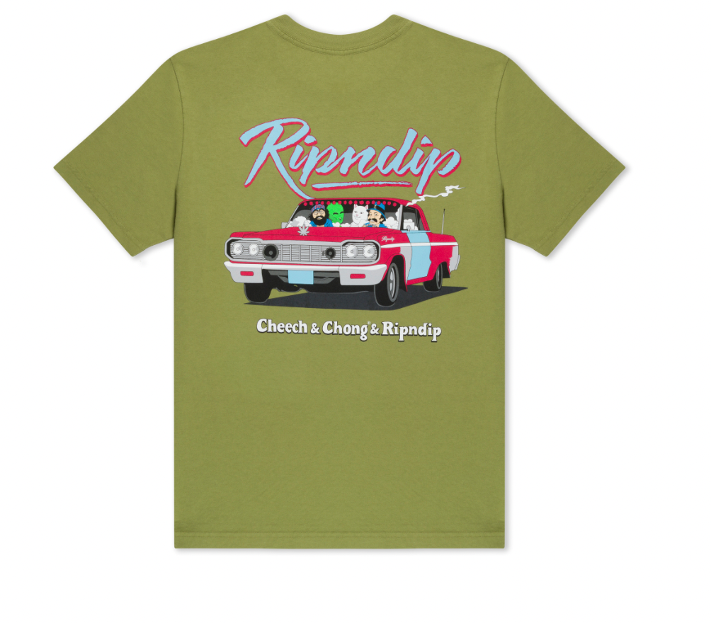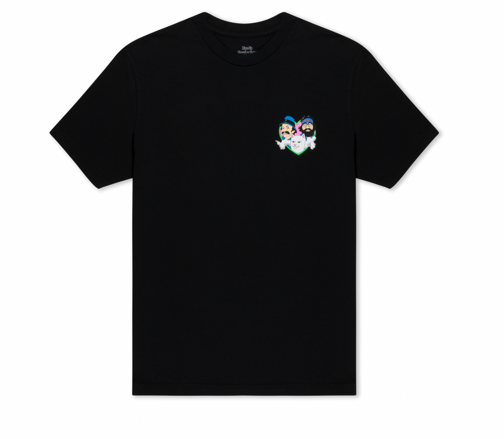 Esta playera forma parte de la colaboración oficial entre RIPNDIP y los legendarios Cheech & Chong, ideal para quienes viven la vida sobre ruedas y con buen humor.